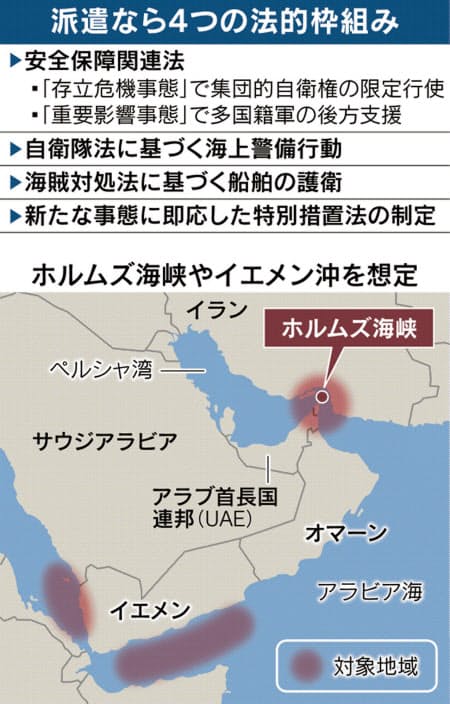 現行法の要件に合わない場合、特措法を新たに制定する可能性もある。ただ国会審議などで時間がかかる。米側の要請を検討した結果、自衛隊の派遣を見送る選択肢もある。伝統的な友好国であるイランとの関係が悪化する懸念もあり、慎重に判断する。