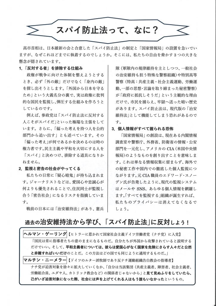 裏面 現代の治安維持法と言われる「スパイ防止法」とは何か?